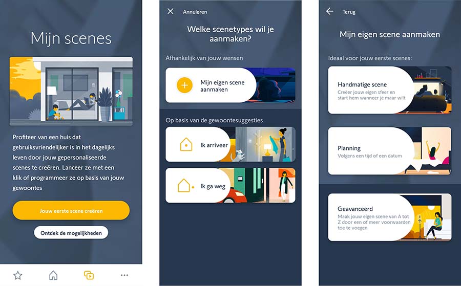 30.05.2022 Woontips door Somfy team Hoe maak ik een scène in TaHoma? De betekenis van een scène, als het gaat om slimme woningen. is vaak een reeks gebeurtenissen, ofwel acties die plaatsvinden wanneer je op een knop drukt of iets op tijd geprogrammeerd hebt. Scènes worden gebruikt om repetitieve gebeurtenissen te vereenvoudigen, te automatiseren, zodat het comfort in huis voor jou toeneemt. Maar scènes worden ook gebruikt om aanwezigheid te simuleren door het openen en sluiten van gordijnen op tijdsinstellingen of het aan en uitgaan van je verlichting, bijvoorbeeld als je niet thuis bent. Dit heeft een afschrikkend effect en verkleind de kans op inbraak. Er zijn 3 verschillende soorten scènes in TaHoma: - Handmatige scène Wordt geactiveerd wanneer u actief op een knop, wandcontactdoos of uw TaHoma-schakelaar drukt. Het kan zijn dat er een licht aangaat op het moment dat het gordijn opengaat als je op de knop drukt. - Geplande scène Deze wordt geactiveerd op een vooraf door u gekozen tijdstip. Zo wordt de terrasluifel uitgedreven en gaat de verlichting om 7 uur 's ochtends aan. - Geavanceerde scène Het gaat hier om een scène die wordt geactiveerd wanneer bijvoorbeeld een sensor iets detecteert. Een voorbeeld kan een bewegingssensor zijn die midden in de nacht de verlichting aanzet en een jaloezie optrekt wanneer hij beweging detecteert. Volg deze stappen om een scène te maken in TaHoma: Open je Somfy TaHoma-app Selecteer het menu voor "Mijn scènes" Druk vervolgens op "Maak je eerste scène" Selecteer vervolgens het type scène dat u wilt maken (handmatig, gepland of geavanceerd) Vervolgens kies je welke apparaten in de scène worden opgenomen Definieer vervolgens wat er zal gebeuren Als je klaar bent, bevestig je door te klikken op "Ik heb al mijn apparaten geselecteerd" Bekijk de samenvatting die wordt weergegeven en als alles correct is, klik dan op "Voltooien" Als je moeite hebt om aan de slag te gaan, heeft de TaHoma-app suggesties voor verschillende scènes die je voor je huis kunt maken. Deze vind je eenvoudig onder de menuoptie "Ontdek de mogelijkheden" in "Mijn scènes". Veel succes met je scènes en geniet van een comfortabeler dagelijks leven samen met Somfy Smart Home! Meer informatie Categorieën Woontips Disqus is inactive