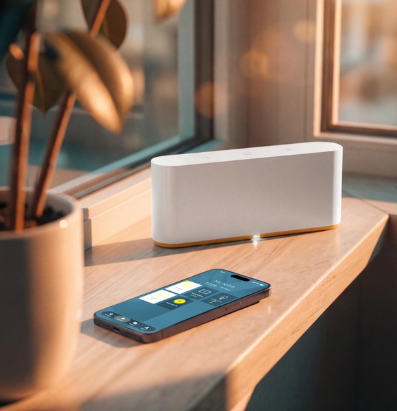 Vanaf je smartphone kun je het geluid aanpassen, de gordijnen sluiten en de lichten dimmen.
