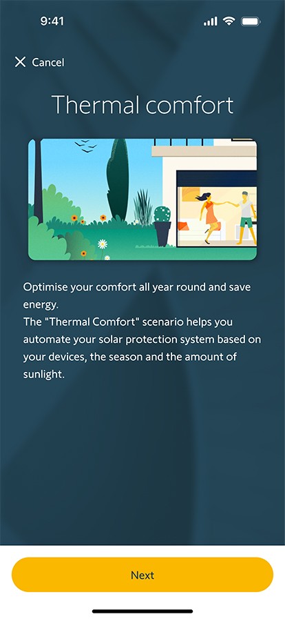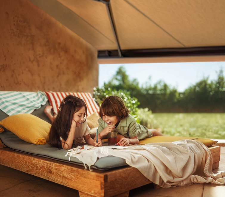 Met de verbonden oplossingen van Somfy geniet je optimaal van je buitenruimte. Je zonnescherm past zich automatisch aan het weer aan, beschermt je kinderen tegen de zon en trekt zich in bij storm.